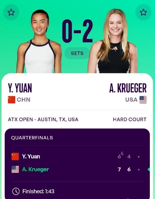 袁悦0-2不敌克鲁格,无缘WTA250奥斯汀站单打四强相关内容