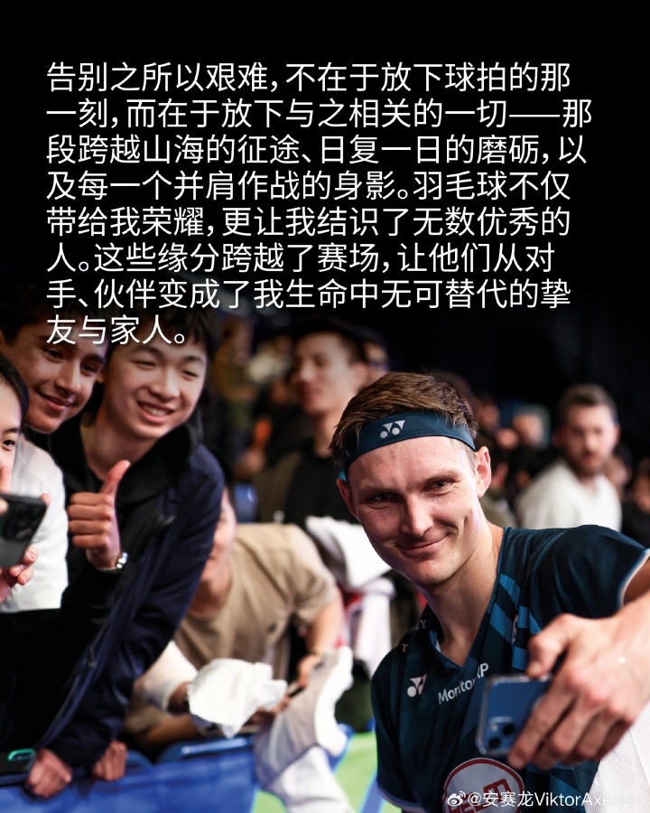 告别之所以艰难,不在于放下球拍的那一刻,而在于放下与之相关的一切——那段跨越山海的征途、日复一日的磨砺,以及每一个并肩作战的身影。羽毛球不仅带给我荣耀,更让我结识了无数优秀的人。这些缘分跨越了赛场,让他们从对手、伙伴变成了我生命中无可替代的挚友与家人。