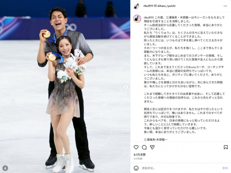 4月17日消息 米兰冬奥会花样滑冰双人自由滑冠军、日本组合三浦璃来/木原龙一宣布退役 。