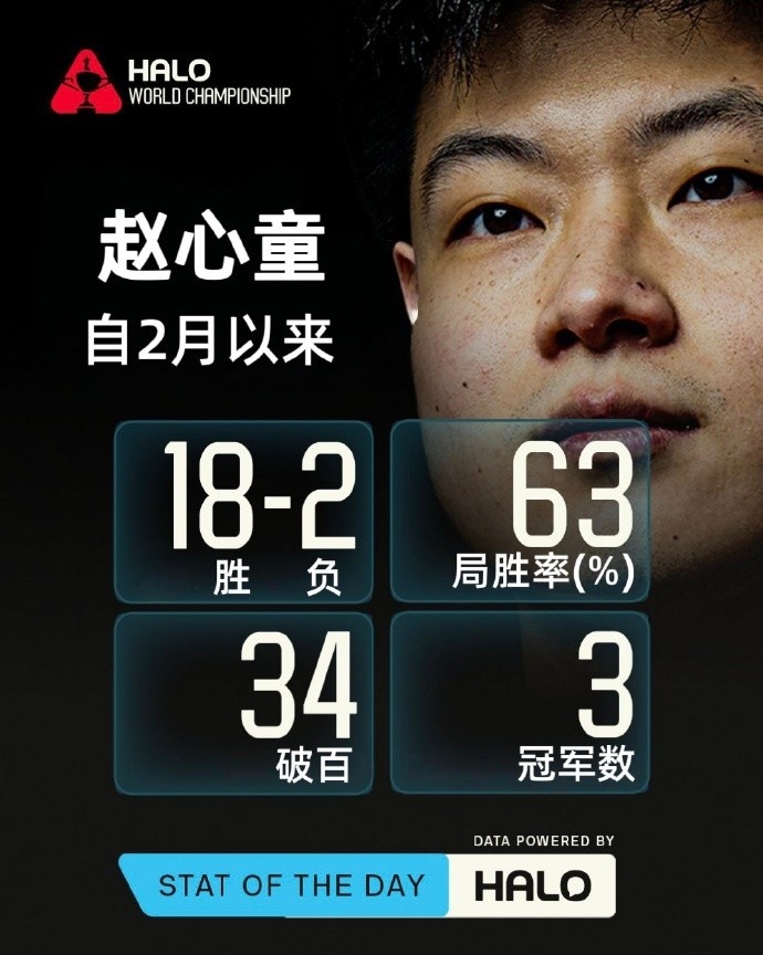 顶级表现!赵心童自2月以来18胜2负,打出34杆破百,收获3冠